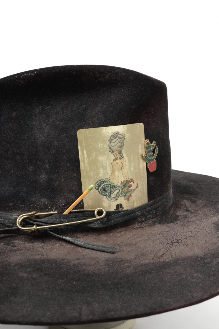上質なビーバーフェルトによるブラックハットをベースに、パラフィン加工や本物の銃を使ったダメージ加工が施された一点。※商品の詳細や在庫状況、お取り寄せなどは、店頭までお問い合わせ下さい。