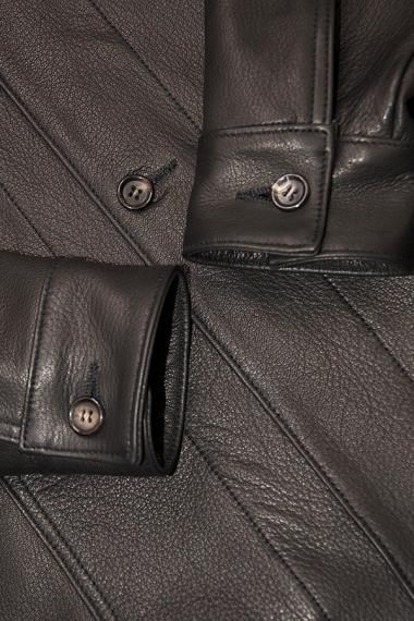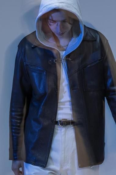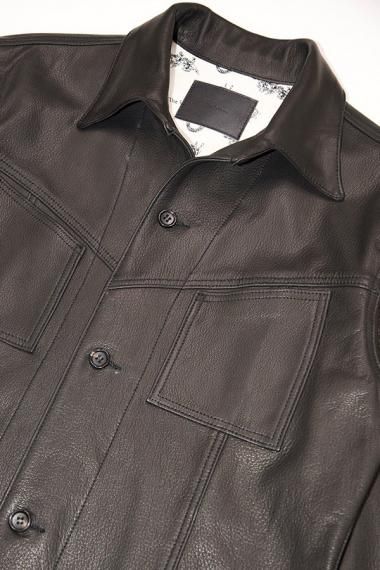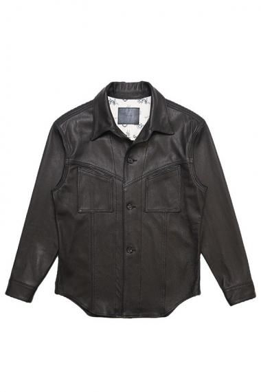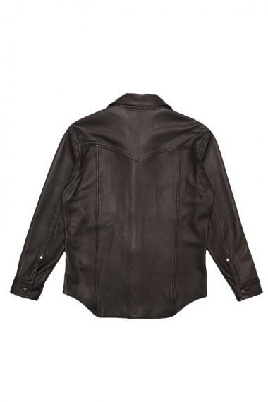 70年代を彷彿とさせるゴートスキンシャツ。 独特なオープンカラーで胸元の切り替えも特徴的であり、ボタンはホーンボタン、袖開き止まりはEND CUSTOM JEWELLERS制作のリベットを使用。 ヨーク裏のみウエスタン柄スレキを用いて、基本的には1枚仕立ての良い意味で荒々しさを残した一着。 素材は、ユーロゴート原皮を柔軟・保存・耐熱・染色発色に富むクローム鞣しを行い、スエード面にナッパラン加工してWフェイスし仕上げています。 ゴートでありながらもディアの様なシボ感があるのもこの革の特徴です。※商品の詳細や在庫状況、お取り寄せなどは、店頭までお問い合わせ下さい。
