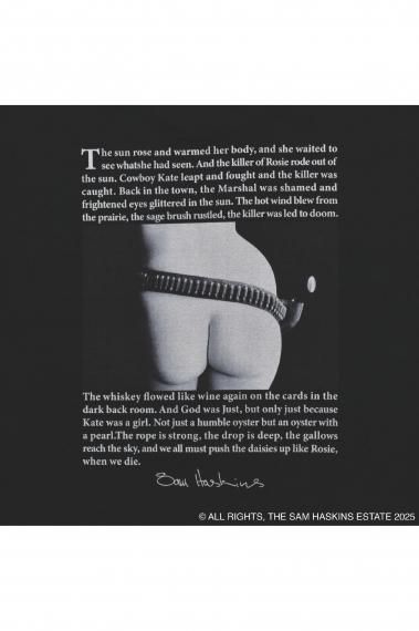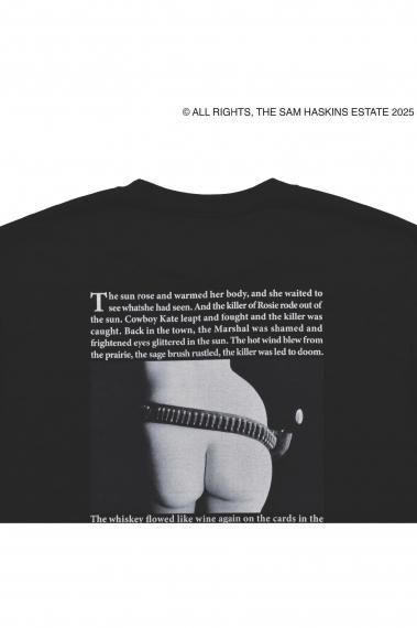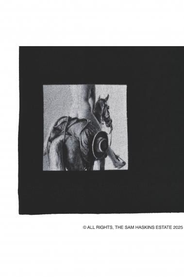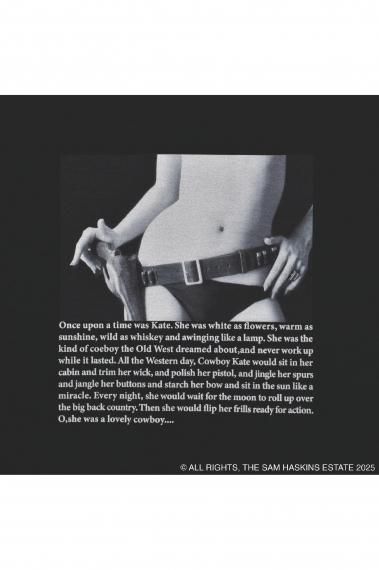 Sam HaskinsとStie-loのコラボレーションは過去に何度か行われてまいりましたが、前回の 2018年以来7年ぶりとなる待望のコラボレーションシリーズは、Sam Haskinsの代表作『COWBOY KATE & OTHER STORIES』(1964年)から作品をチョイス。 『COWBOY KATE & OTHER STORIES』は、表現とイメージデザインの手段としてモノクロ写真を採用した、20世紀でおそらく最初の芸術的モノクロ写真集である。 当時多大な影響を与え、全世界で約 100 万部が売れた同作品は、1964 年にフランスのナダール賞(Prix Nadar)を受賞。 ・フロント、バック共にホルスターを装着した女性の写真をプリント。 ・フロントには前を向いた写真、バックには後向きの写真がそれぞれ採用。 ・17番単糸の空紡糸を使用したドライタッチな天竺素材を使用。 【Sam Hasikins】 英国人写真家。1926 年、南アフリカのクルーンスタッドに生まれる。 ヨハネスブルグ、ロンドン、ニューヨーク、シドニーを拠点に活動、アフリカ独特のエネルギーと欧州の洗練・技法を併せもつ個性で、ヌード写真をありふれた表現方法から解放した。 『Five Girls』(1962)、『Cowboy Kate & Other Stories』(1964)、『November Girl 』(1967)、『African Image』(1967)などの諸作は、自ら手がけた美しい造本で知られる。 【Stie-lo】 Stylist 野口 強が主催する Creative Label。 世界の一流アーティストやフォトグラファーとコラボレーションしたアイテムを通じてアート作品に触れる機会を提供。※商品の詳細や在庫状況、お取り寄せなどは、店頭までお問い合わせ下さい。