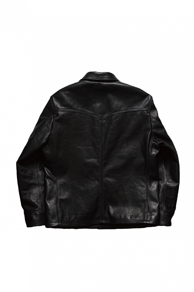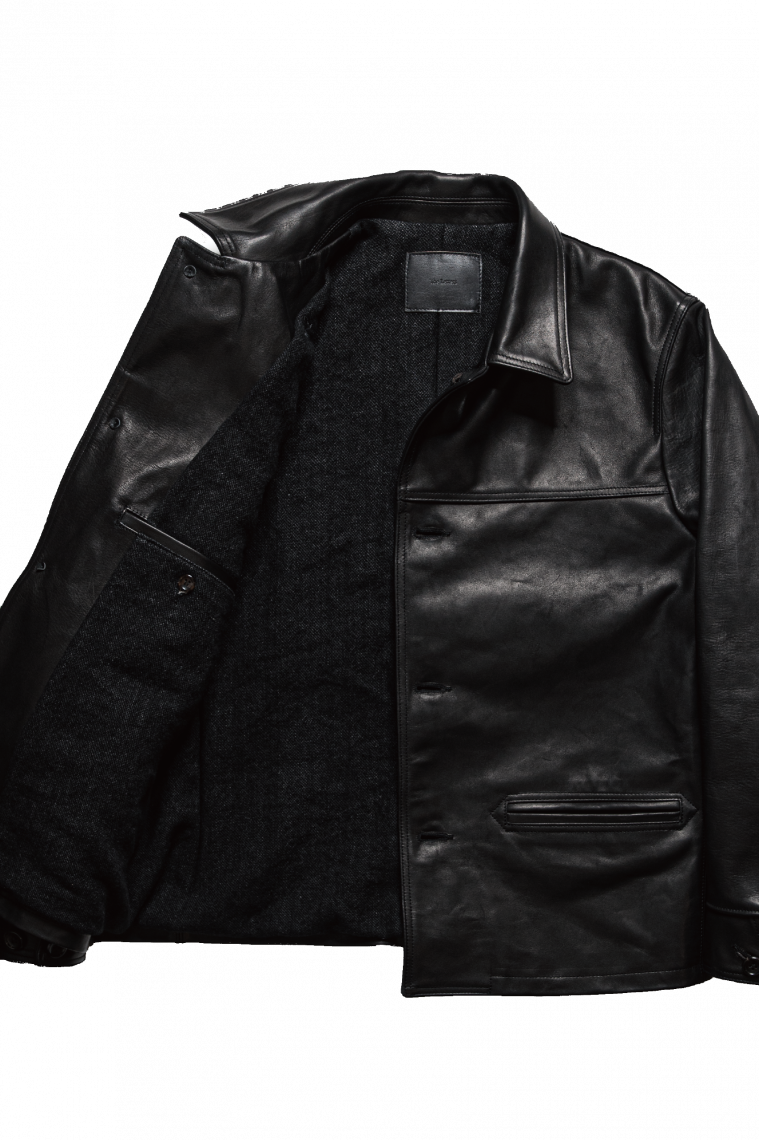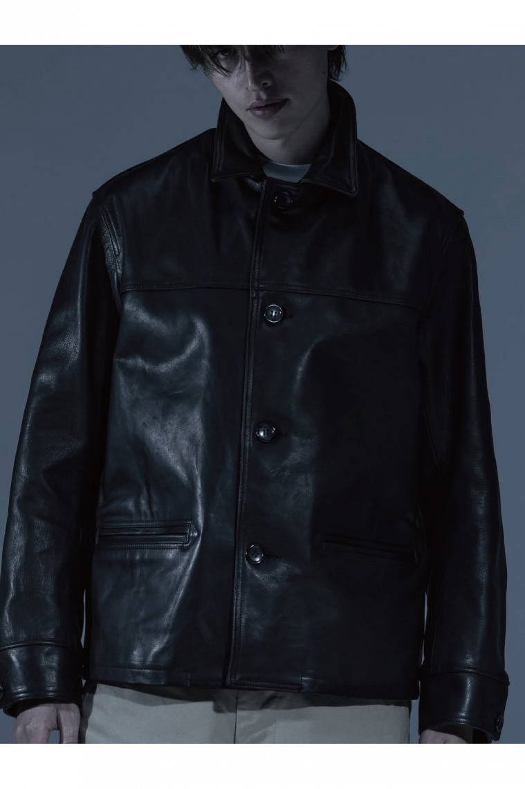 イタリア産ホースハイドを使ったオーセンティックなカーコート。 茶芯の下地に、日本で再クローム→タンニンのハイブリッド鞣しを施し、さらにオリジナルワックスで深みあるマットブラックに仕上げています。 着込むほどに艶が増し、茶芯が自然と浮き出る経年変化も魅力。 シルエットは短丈のボックス型、背面にはさりげないウエスタンヨーク。 身頃には暖かいウールリネンツイード、袖には滑りの良いコットンレーヨンツイルを使用。※商品の詳細や在庫状況、お取り寄せなどは、店頭までお問い合わせ下さい。
