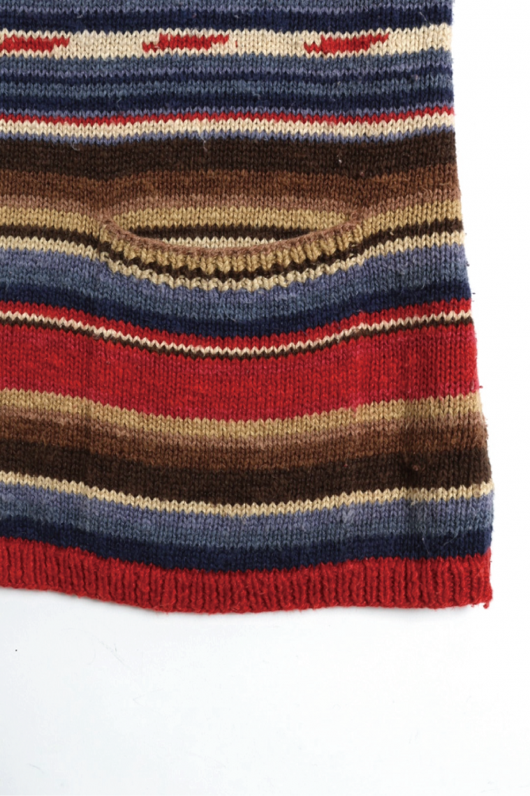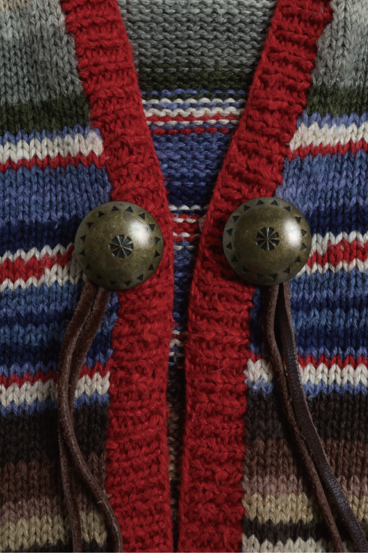 フロントにコンチョボタンとレザーシューレースの組み合わせが特徴的なハンドニットカーディガンで、ブランドオリジナルのネイティブ柄デザイン。※現行品・新品とは異なりますので、ご理解いただける方のみご検討下さい。商品の状態や詳細、在庫状況などは、店頭までお問い合わせ下さい。